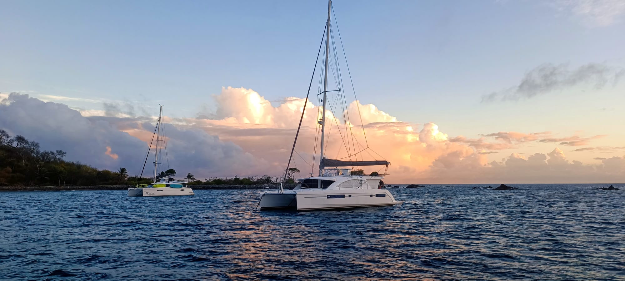 Accroché à son ancre, notre bateau se retrouve systématiquement face au vent, ce qui apporte beaucoup de confort lorsque l’on fait du rangement, en se contorsionnant dans les cabines. La présence de ce vent nous offre aussi un autre avantage : ne pas être envahis par les moustiques, puisque nous ne mettons pas les moustiquaires afin de faciliter le nettoyage.